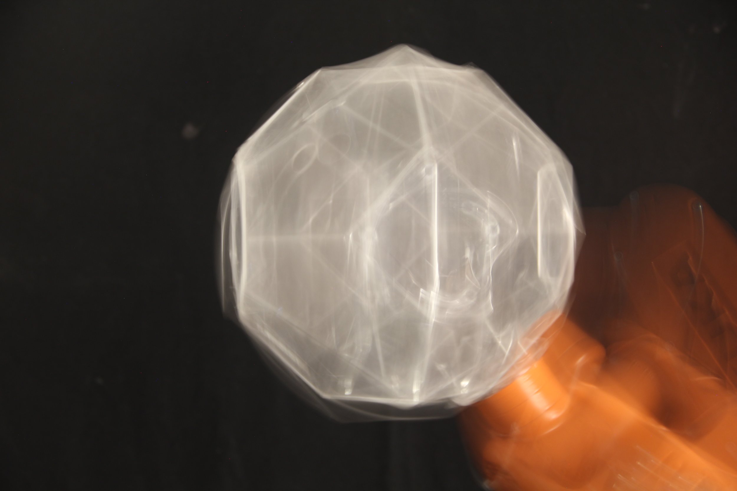 This work investigated a novel method for the production of thin shell objects with a robotically actuated polyhedral mould. Capitalizing on the complex 3D motion paths achievable by an industrial robot arm, fluid material is spread around the interior of the mould by gravity as the mould is turned and manipulated by the robot. As a result, solid or open shell elements are produced with controllable openings, thinly covered areas, and thickly reinforced panels.